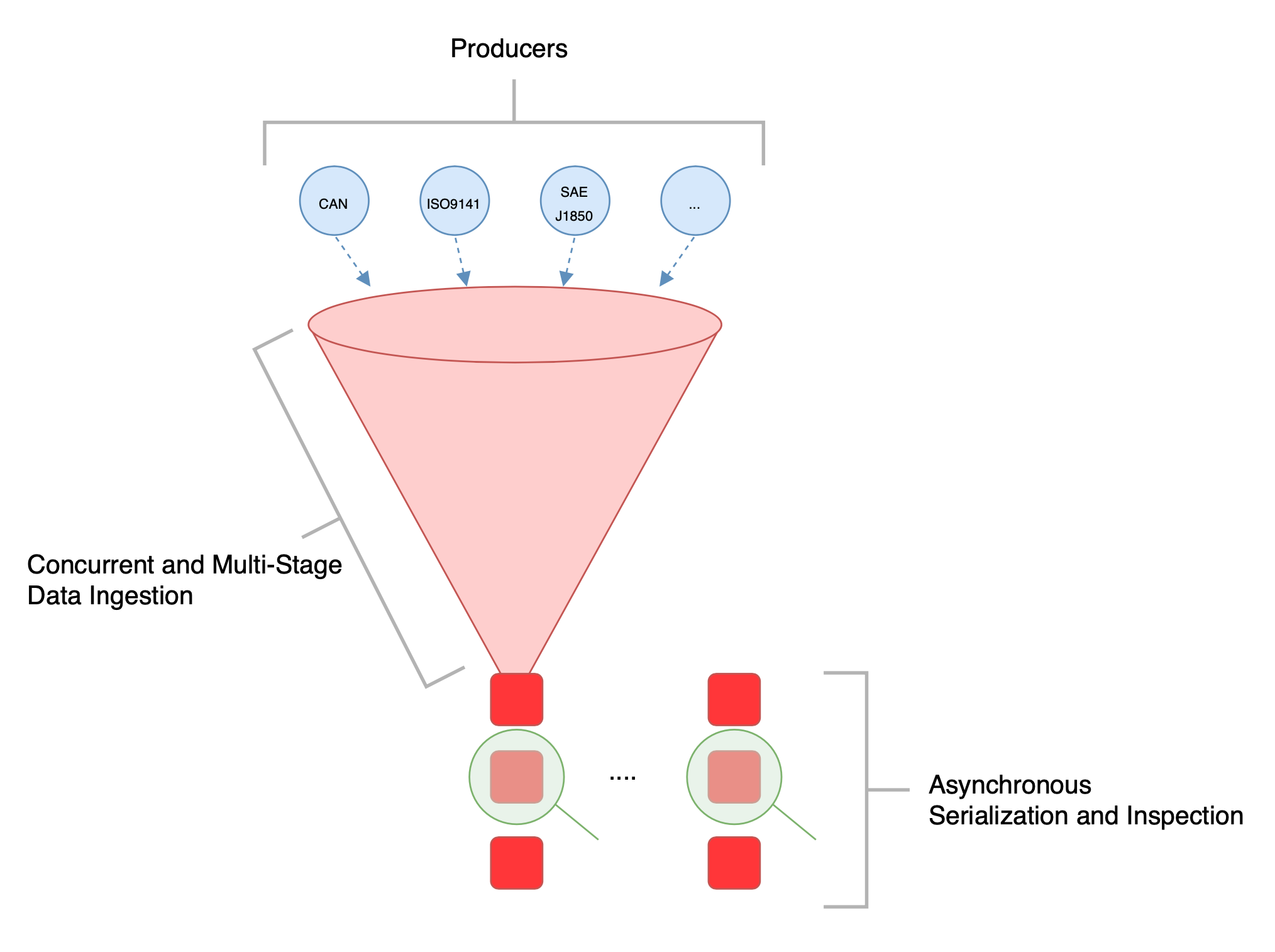 A concurrent and multi-level data input and data processing pipeline is to be realised for the processing pipeline. It must also be possible to efficiently consume different sources, the so-called producers. It would also be desirable if there was the possibility to configure the processing pipeline with regard to the resources to be used. More precisely, the number of processes for producer and consumer as well as the concurrency and the batch size to be used. In the figure below you can see an schematic overview of the pipeline. The blue circles in the figure symbolise the producers. As already mentioned, it will be possible to develop a producer for each protocol. So in the future there may be a producer for CAN, one for ISO9141 and so on. There is a uniform interface to adhere to. The producers then send their messages to the concurrent and multi-stage data ingestion service. There, the incoming messages should be analysed and then asynchronously serialised and inspected. Here, serialisation refers to the application of the active rules and not to the quantity of messages.